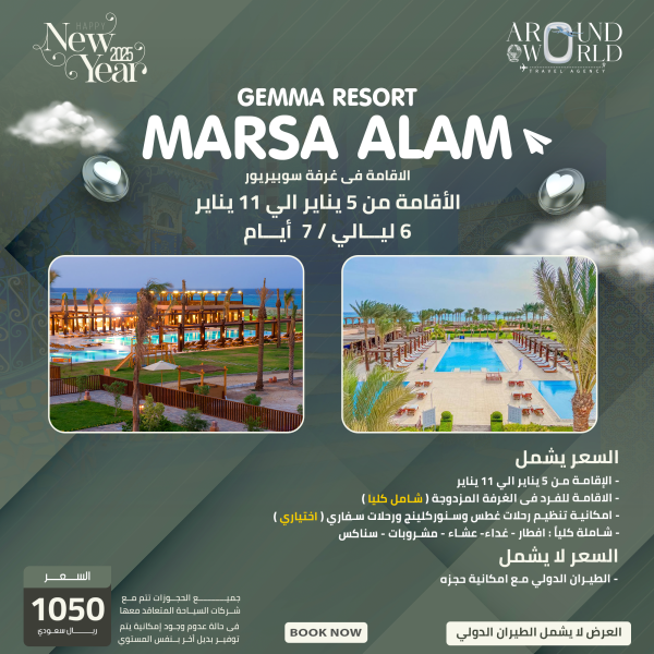 السعر يشمل – الإقامة من 5 يناير الي 11 يناير – الاقامة للفرد فى الغرفة المزدوجة ( شامل كليا ) – امكانية تنظيم رحلات غطس وسنوركلينج ورحلات سفاري ( اختياري ) – شاملة كلياً : افطار – غداء – عشاء – مشروبات – سناكس